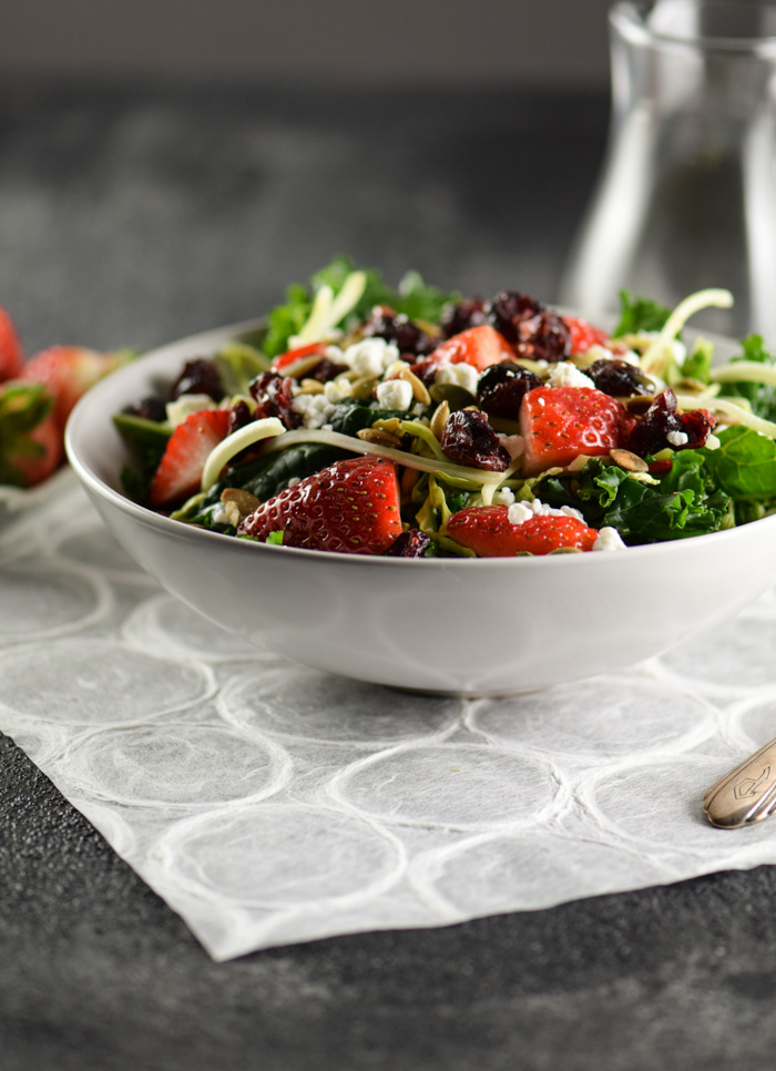 - Once the kale is softened, divide between two large salad bowls. Top with strawberries, broccoli slaw, shaved brussels spouts, goat cheese, dried cranberries and pumpkin seeds. Top with dressing and toss to coat. Season with sea salt and black pepper. Serve immediately.