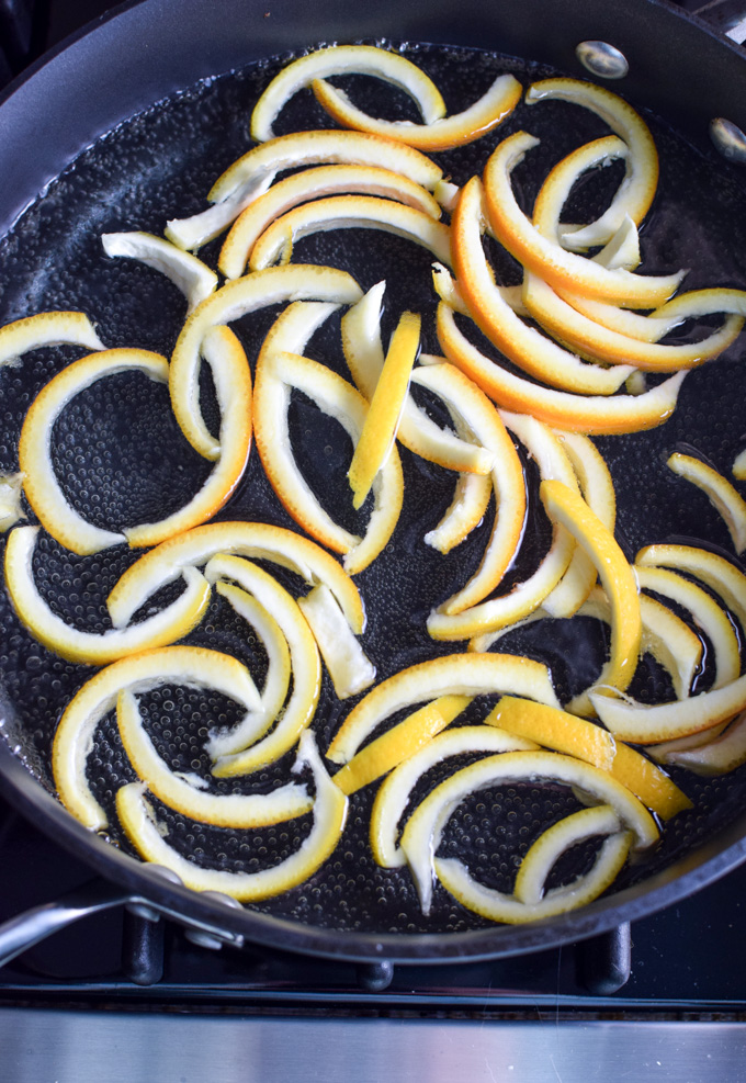 - Rinse the oranges well and cut the top and bottom off of each orange. Score the skin of each orange into quarters; peel the oranges, keeping the pith with the peel. Cut the peel into thin strips, about ¼ inch wide. Place peels in a sauté pan, cover with cold water and bring to a boil. Drain and repeat two more times.