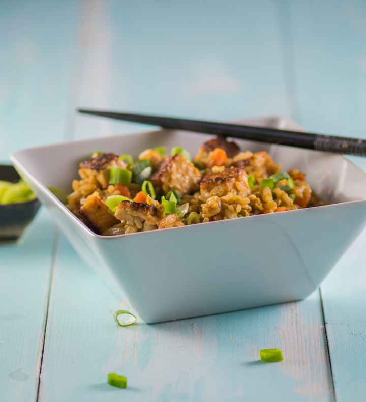 Better than takeout, this Ginger Tofu Fried Rice gives you a fairly quick and easy option for a great-tasting and satisfying everyday meal. Crispy tofu, brown rice, veggies, and a tangy sauce come together to create a vegetarian delight.