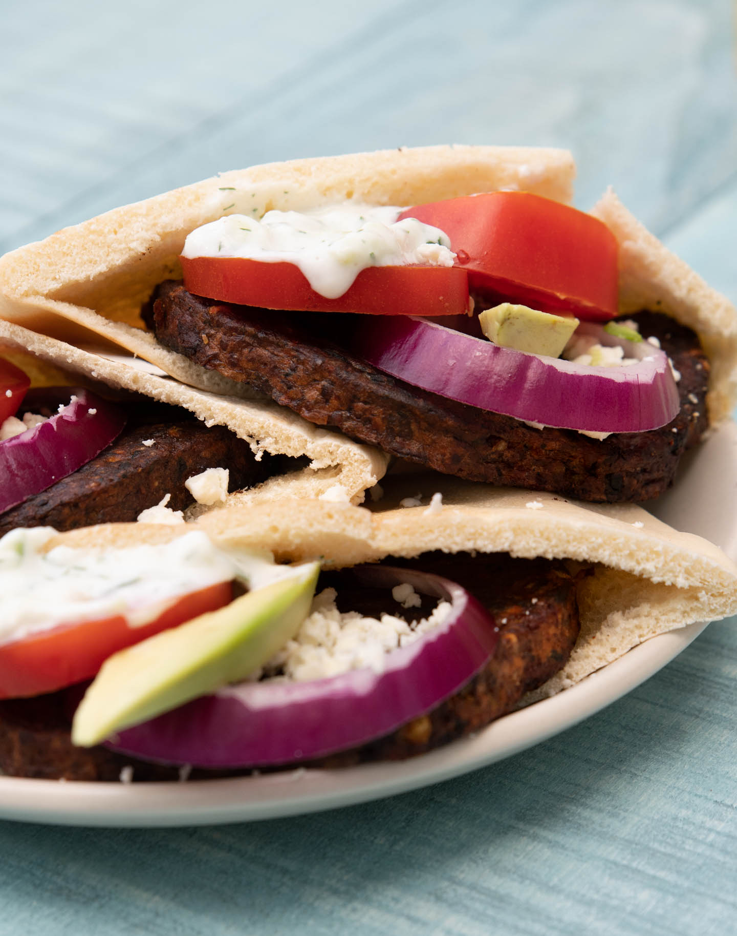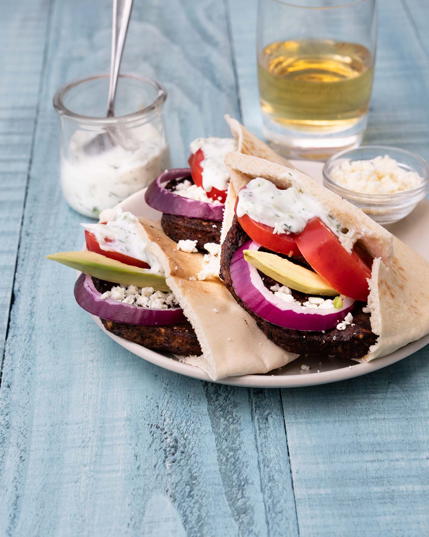 - Add a burger patty to each half pita round. Add tomato, onion and avocado. Top with feta cheese and tzatziki sauce. Serve immediately.