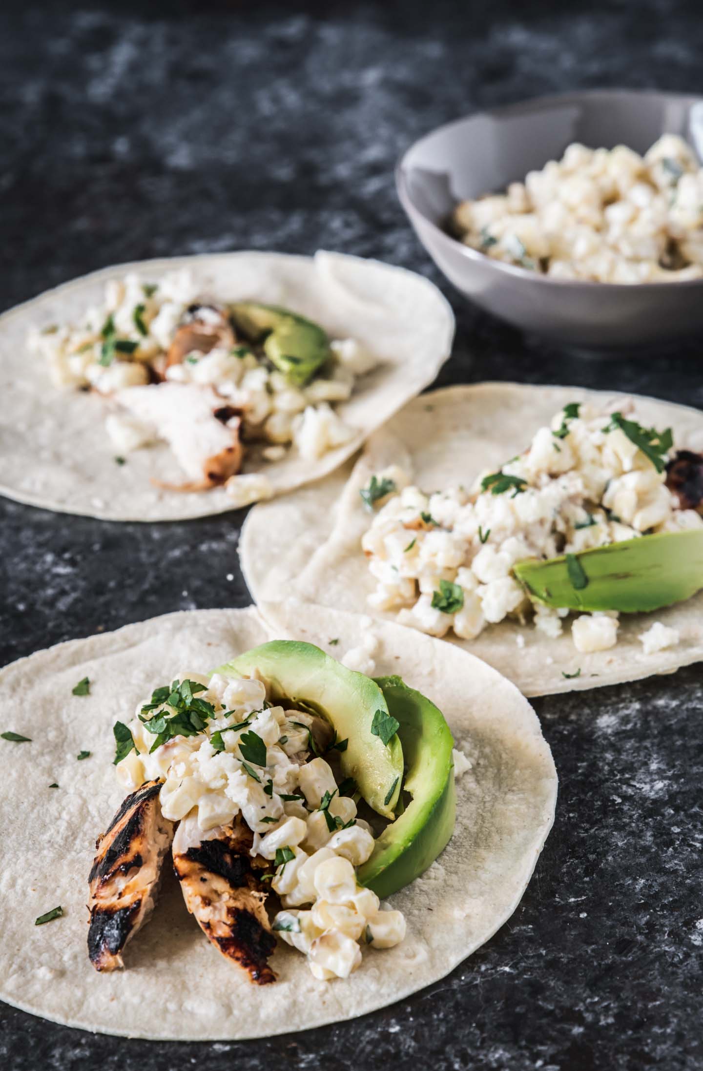 Step 8 | Assemble the tacos. Place the tortillas on plates or a serving dish and top with grilled chicken, elote sauce, avocado slices and some cheese. Serve immediately.