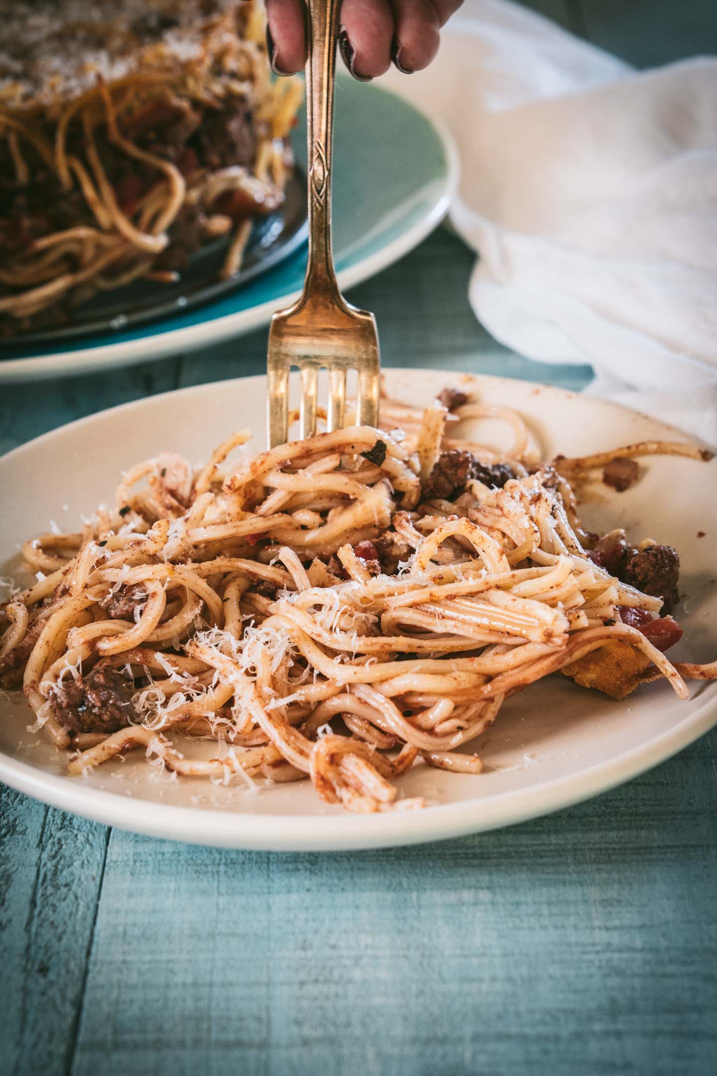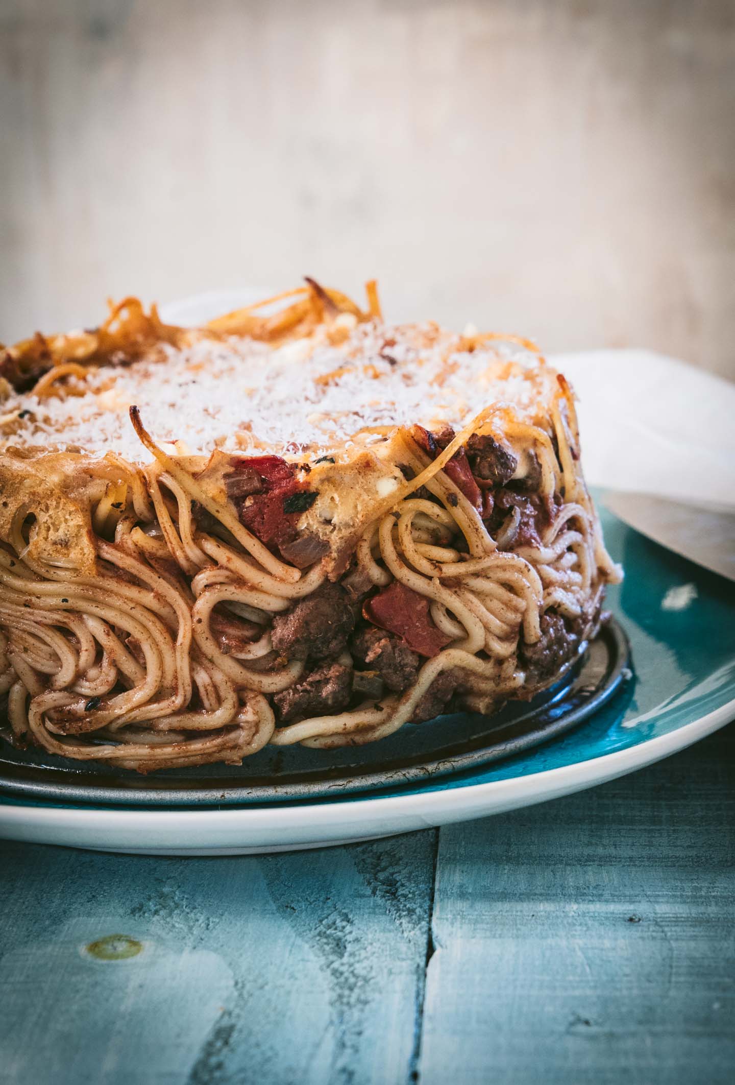 The meat sauce is pretty much like a traditional meat sauce with ground beef, tomatoes, wine and spices. You can make just the meat sauce a day or two ahead of time or you can make the spaghetti and meat sauce ahead of time and then keep in the refrigerator for a few days. Leftovers of this dish keep well, so unless you are wanting to serve the entire pie whole I actually recommend making it ahead of time and then storing any leftovers in an airtight container.