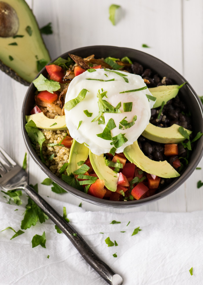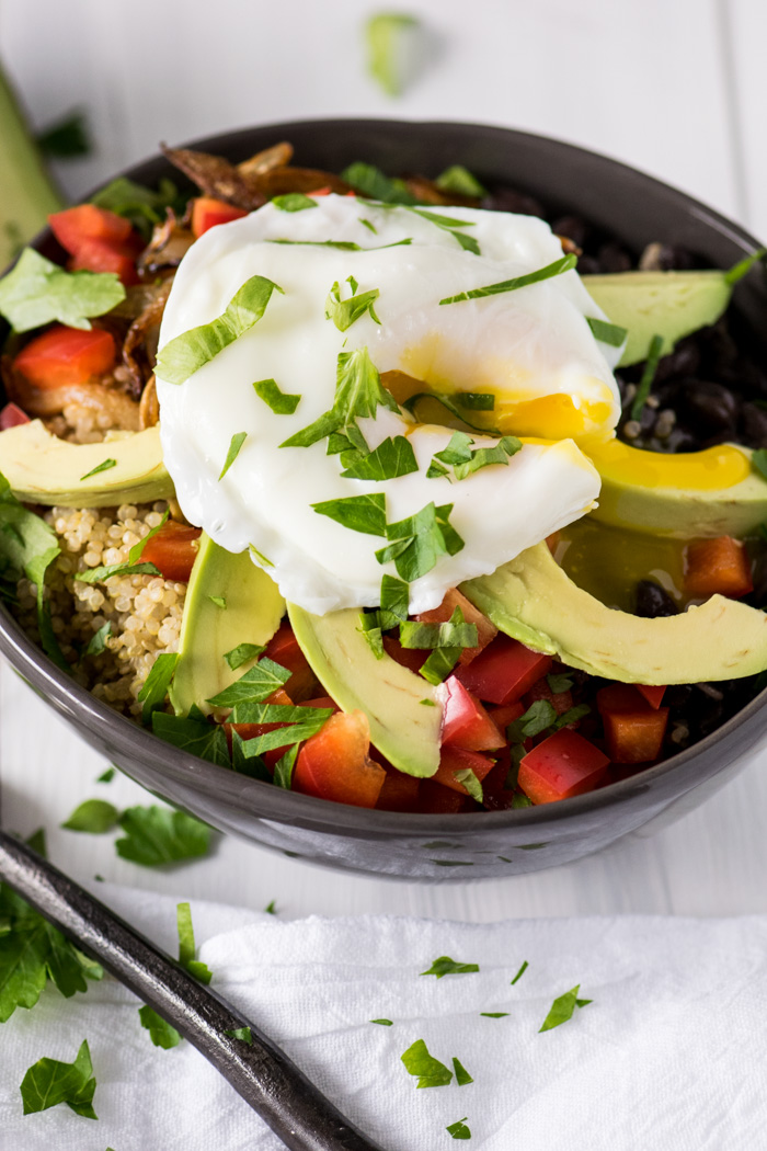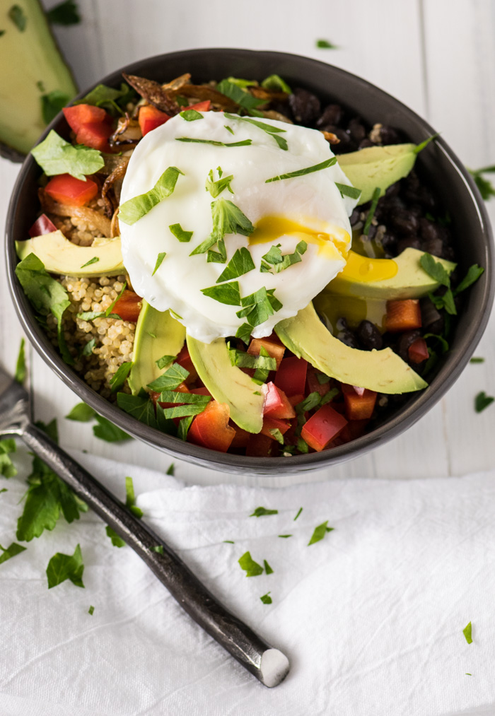 This bowl starts with a good-sized serving of quinoa. Then you'll add in some black beans and some of those yummy caramelized onions which are always one of my favorites. Throw in a bit of slightly sweet diced red pepper and some creamy avocado. Then you'll top it off with a lovely jammy egg, which provides an almost sauce-like topping for the quinoa. YUM! You've got a super tasty, healthy filling meal.