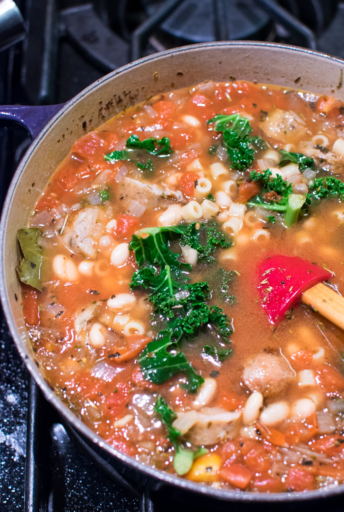 - Finish the soup. Add sausage and kale, and cook for an additional 10 minutes. Remove bay leaf before serving.